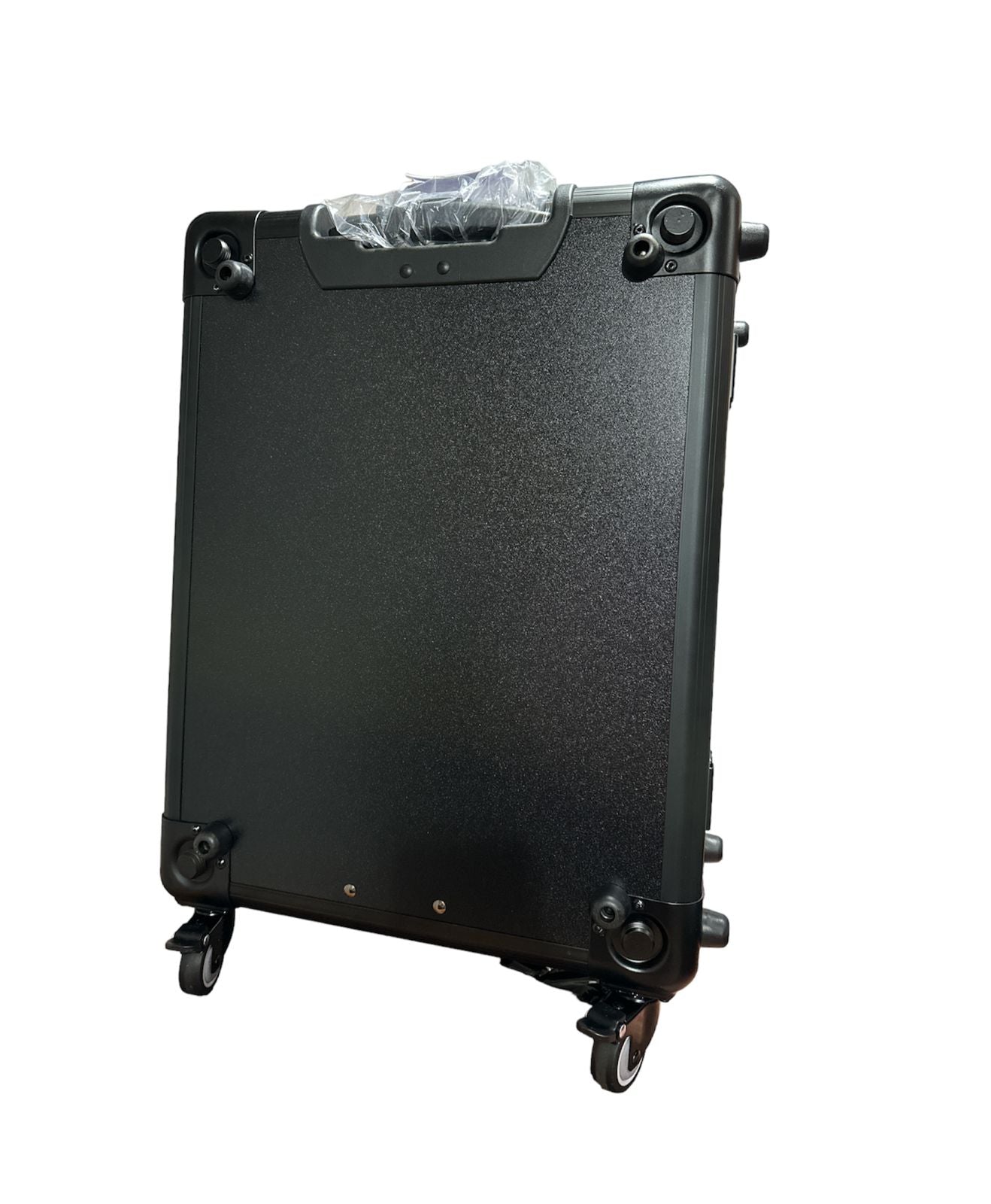 Maletín maquillaje en piel negra con carro. Dispone de 4 cajones, espejo de 40w con regulador de intensidad Con Luz Led. Provisto de 4 patas telescópicas roscadas que se guardan en la base de la maleta. Adecuado para rodajes en exteriores y para crear zona de maquillaje en peluquerías.