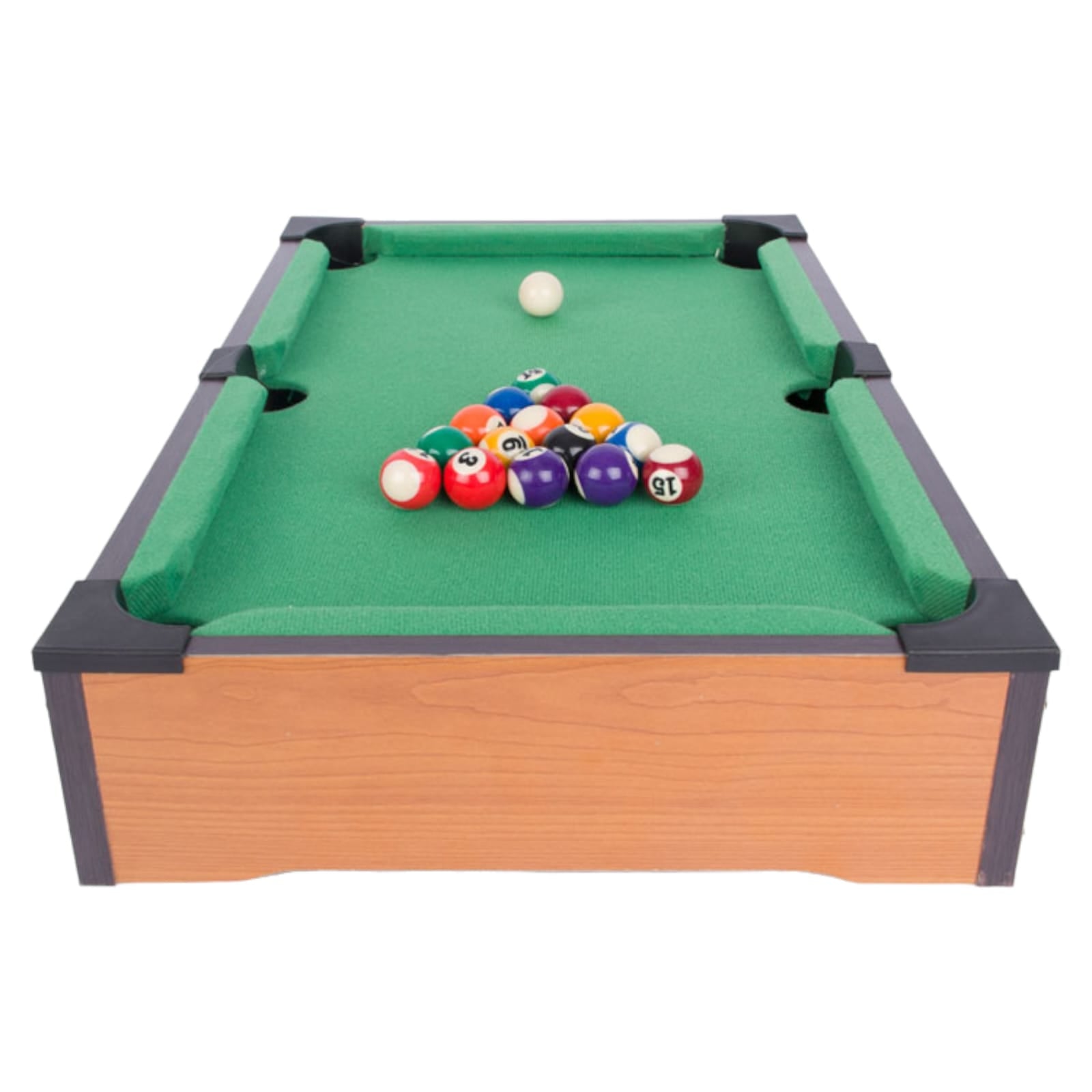 Juego de Mini mesa de Pool con base de madera y paño verde de primera calidad. El tamaño compacto permite un fácil almacenamiento y portabilidad.