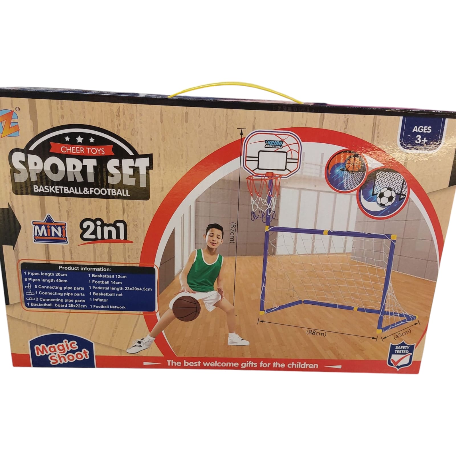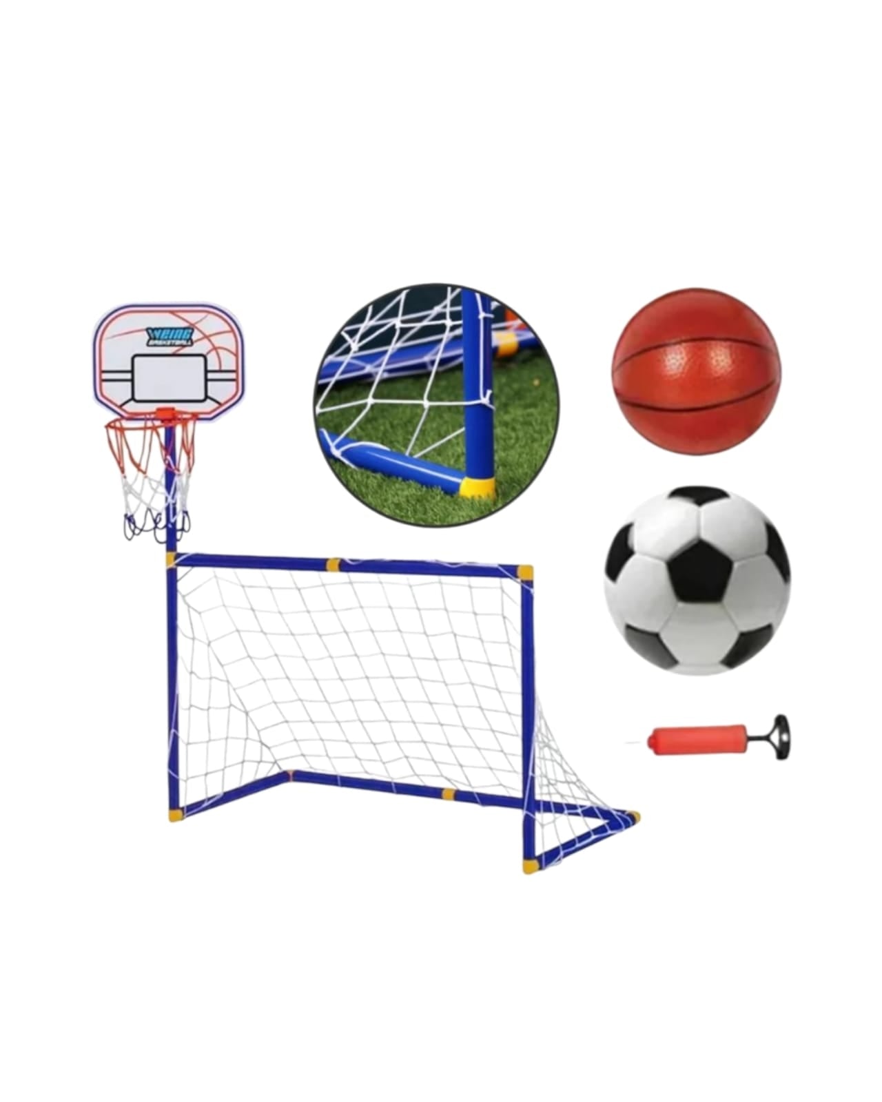 Equipado con una red de baloncesto en la parte superior derecha y una portería de fútbol en la parte inferior para que los niños puedan jugar fútbol y baloncesto juntos.