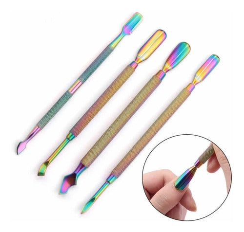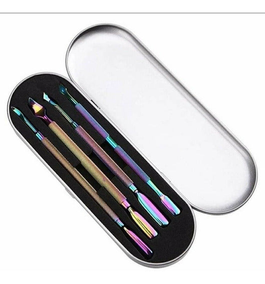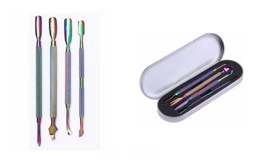 Set 4 Repujadores de Cuticula Arcoiris, Manicure Pedicure Profesional Caja metálica con 4 repujadores profesionales para manicure y pedicure, acero Inoxidable. Descripción: * 1 Caja metálica con 4 repujadores de cutículas, acero inoxidable.